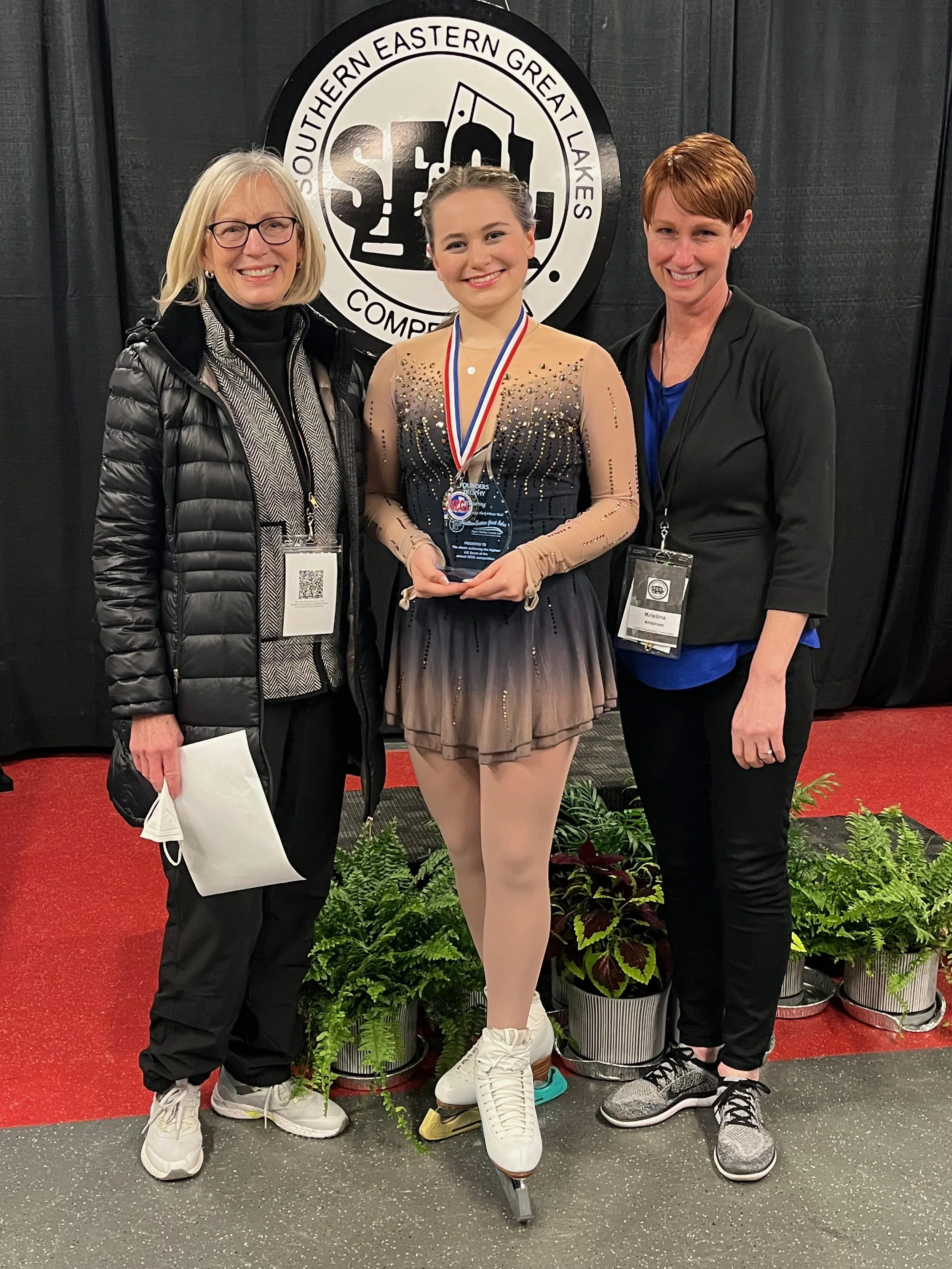 Congratulations to Louise MacKay who won the Founders Award at the 2022 SEGL competition for highest IJS score in a freeskate program. Louise is pictured above with Sheri Carey (left) and SEGL President Kristina Alstrom. Louise is also celebrating becoming a Triple Gold Medalist, by passing her Senior Solo Free Dance test!